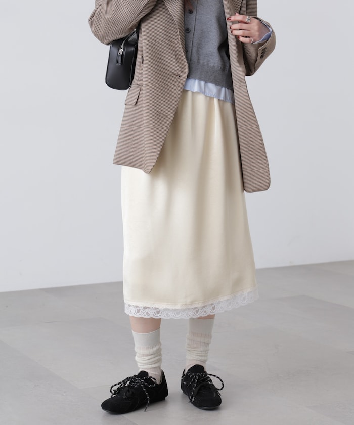 動くたびにキレイな表情を見せる、しなやかなサテン素材のミディスカート。