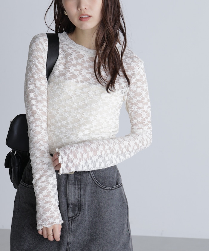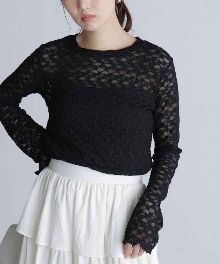 一枚でもキレイに決まり、ニットやカーディガンのインナーとしてレイヤードも楽しめる長袖レースカットソー。