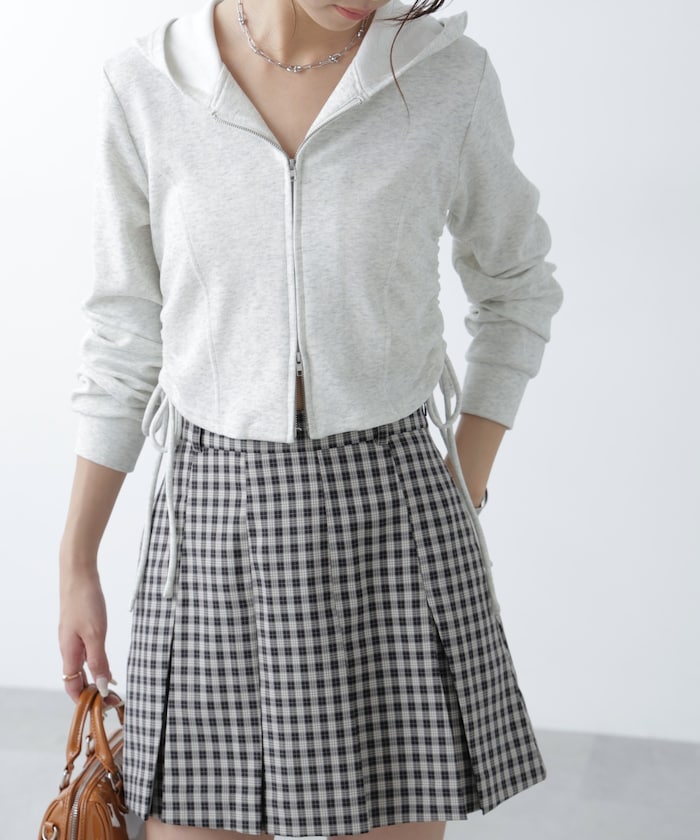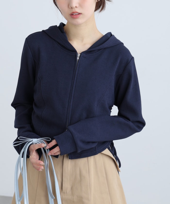 コンパクトなシルエットに両脇のドロストデザインが映えるジップパーカー。