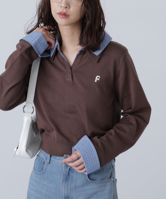 綿タッチのニットポロにシャツをレイヤードしたようなドッキングデザイントップス。