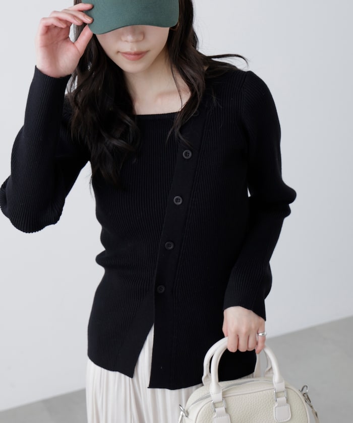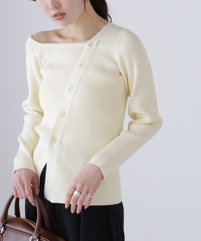 襟ぐりと前立てがアシンメトリーデザインのリブニット。