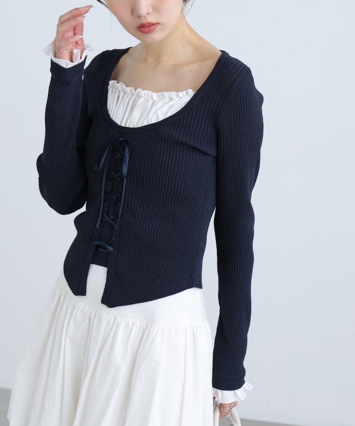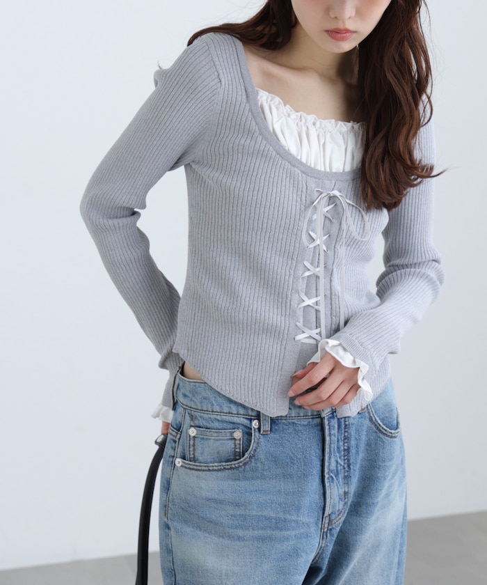 フリルブラウスを重ねたような異素材ドッキングデザインで、袖口にもフリルをあしらい統一感をプラス。