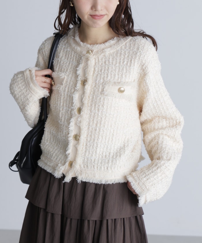 リボンテープがちらちら見える可愛い編地のニットツイードカーディガン。