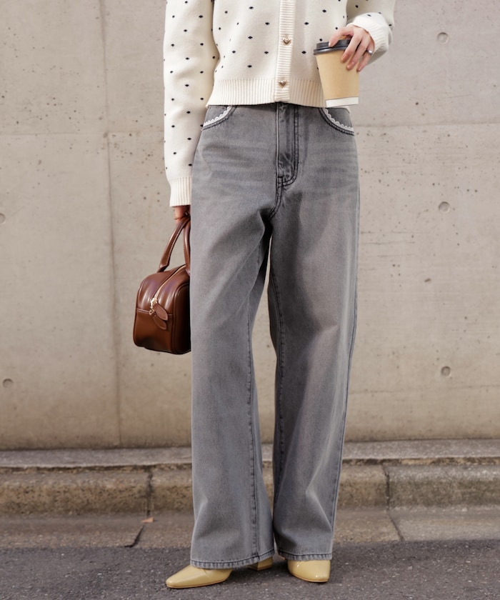 さり気ないレーストリミングがポイントのデニムパンツ。