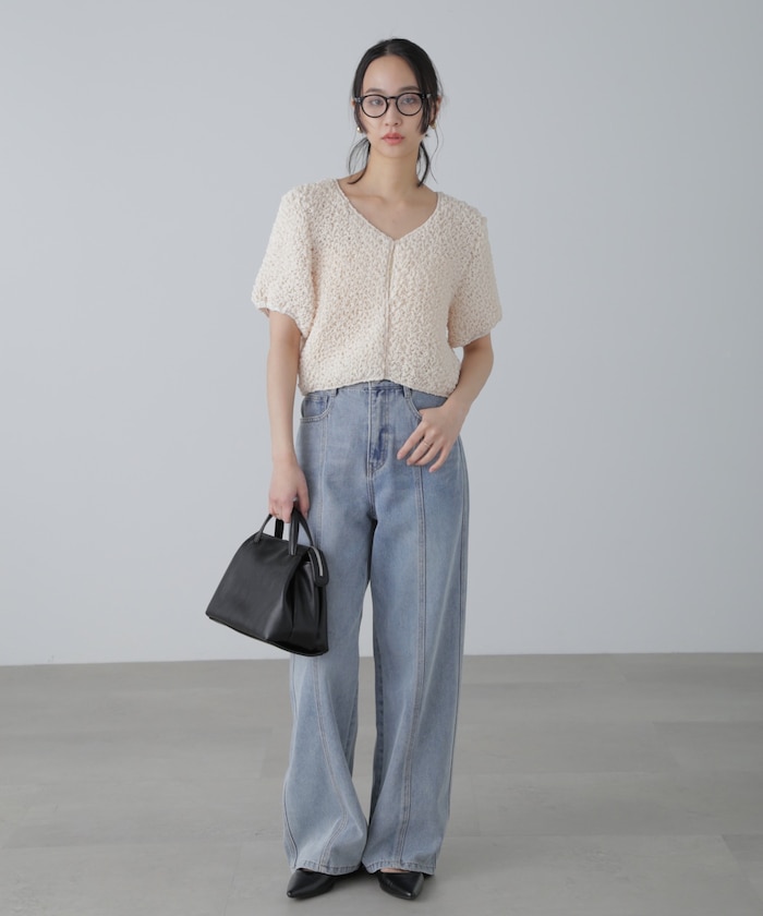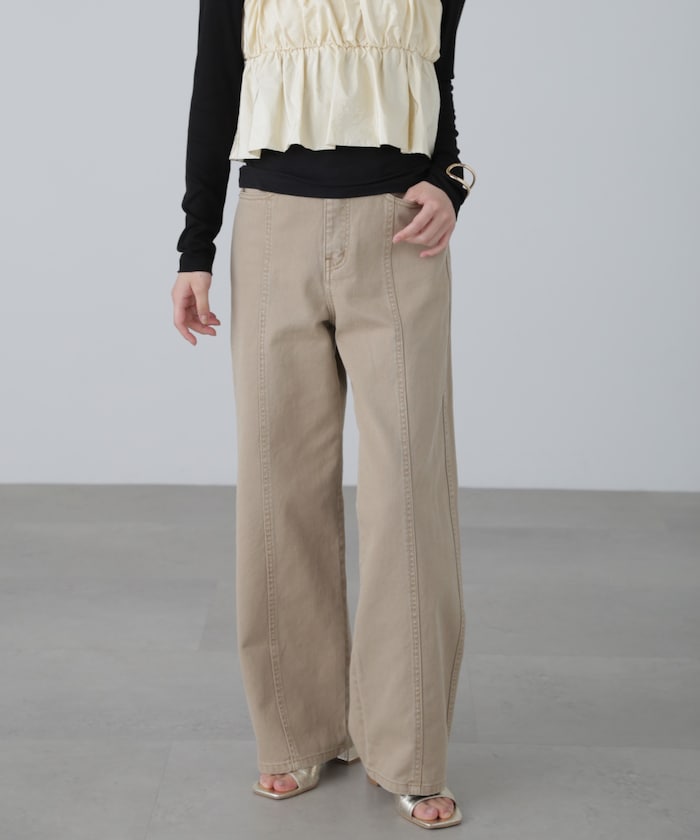 カラーが映えるワイドデニムパンツ。