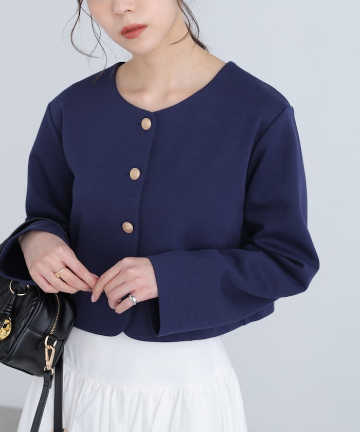 打ち込みの良い厚手のカットソーを使用した、軽くて動きやすいノーカラージャケット。